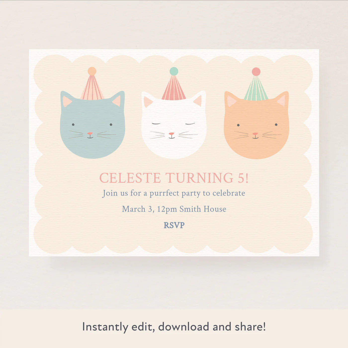 - These adorable invitations feature three cute kitties perfect for younger kids' birthday parties.