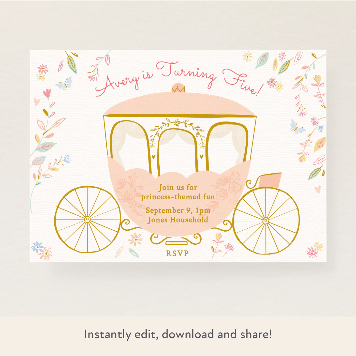 - Your carriage awaits with this pretty invitation featuring a princess carriage.