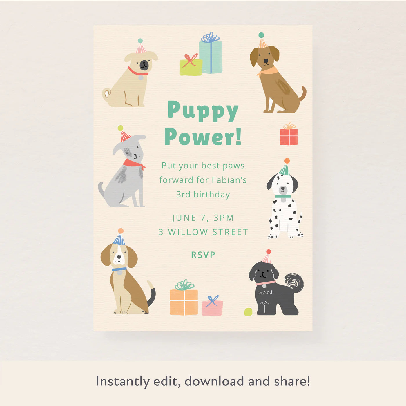 - The cute invitation features sweet puppies for younger kids' birthday parties.