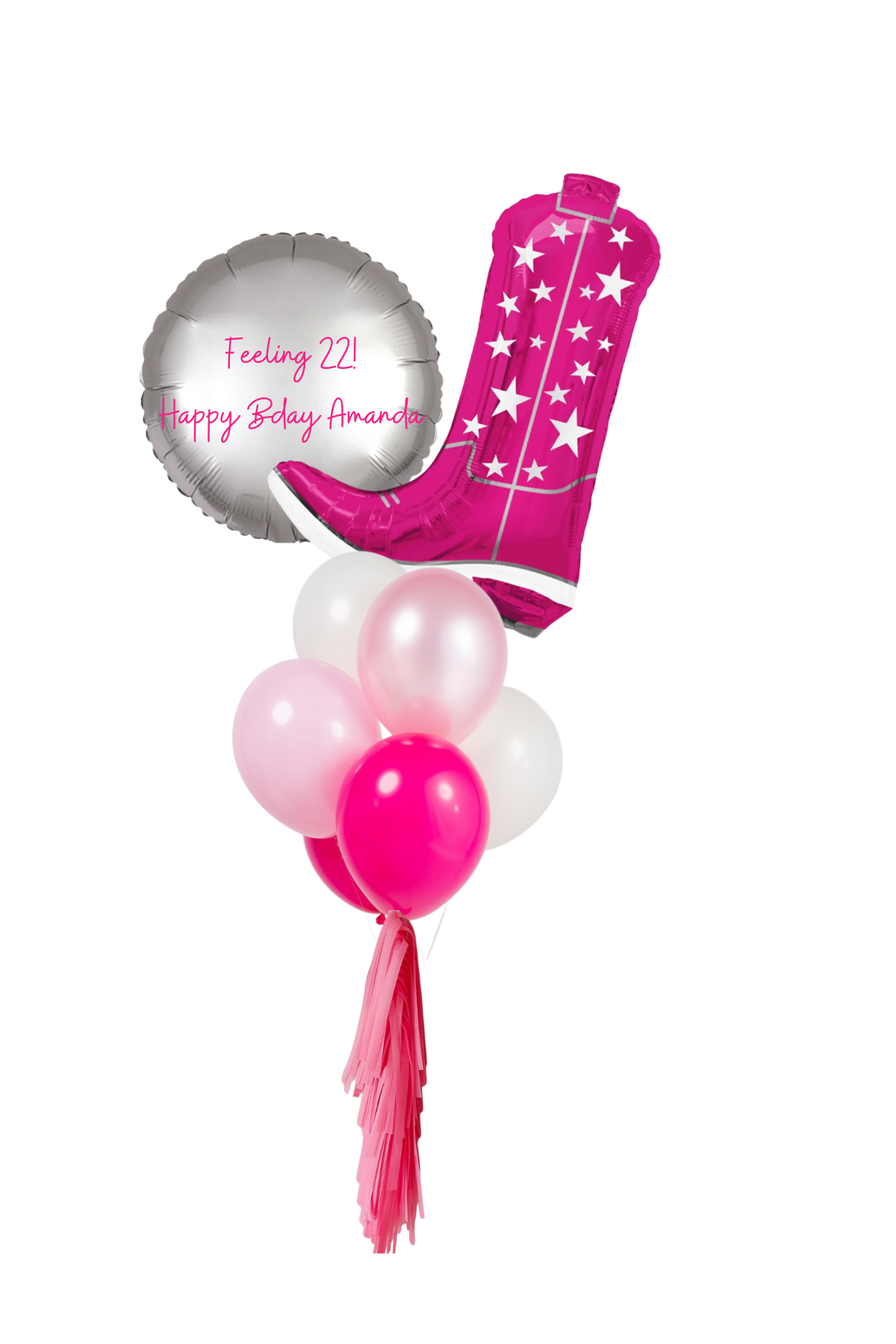 - Includes: 26" cowgirl boot ballon, 18" personalized round balloon, 12 latex balloon bouquet, tassel tail and weight.