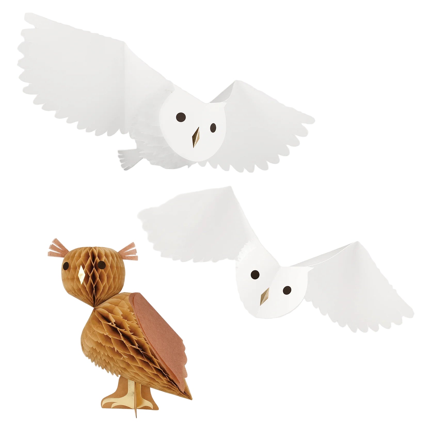 - The white owls' honeycomb paper bodies are easily opened and held in place with hidden magnets