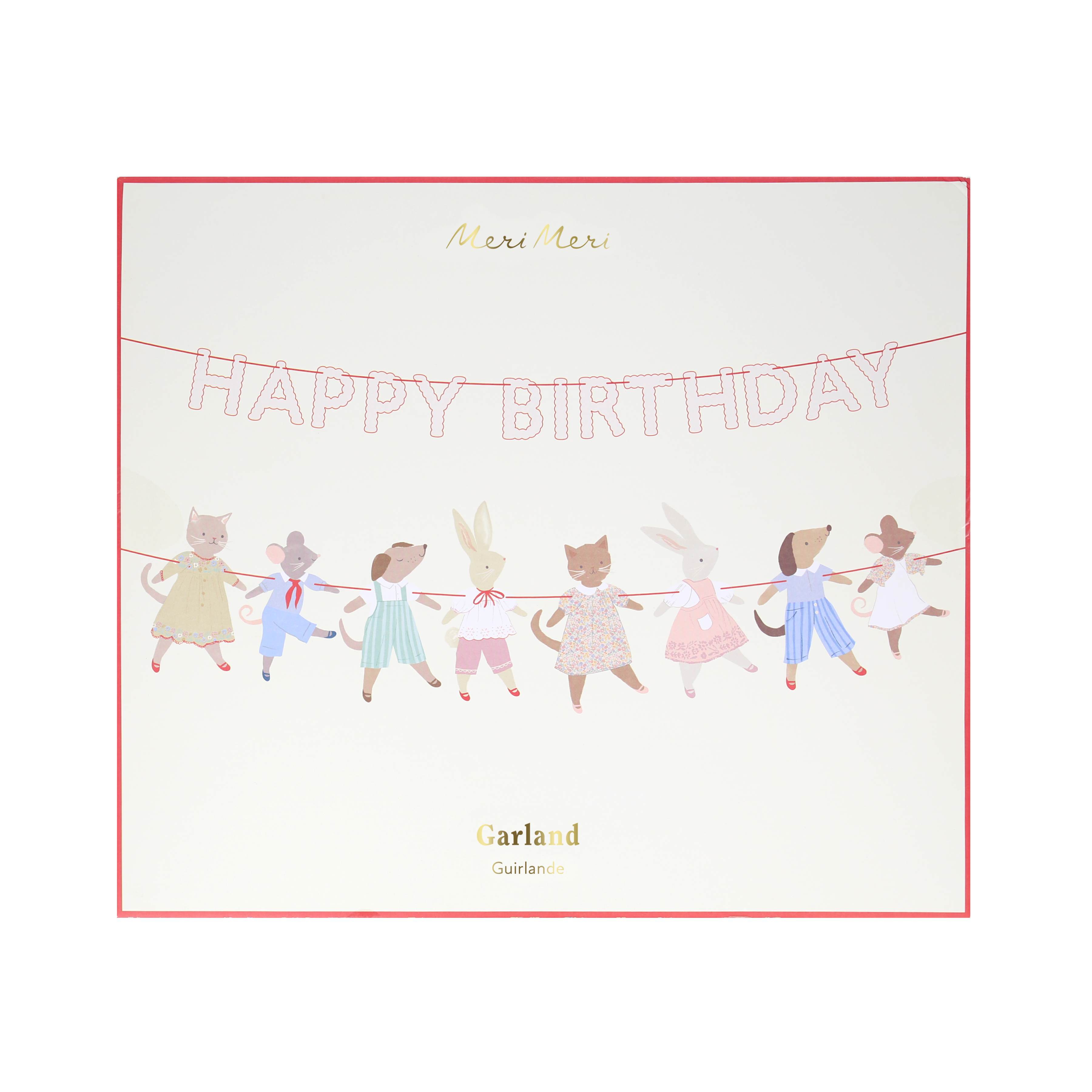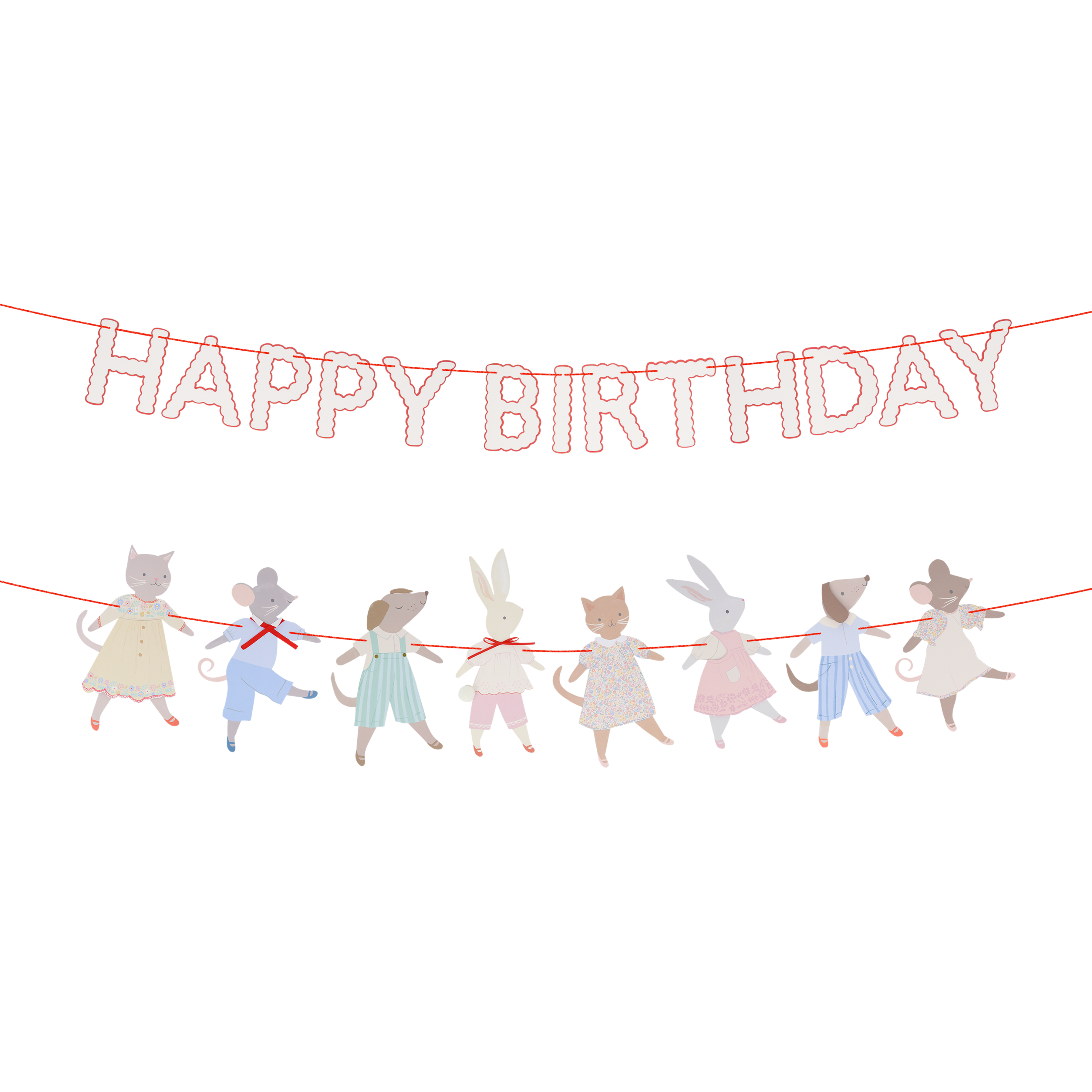 - One string has the phrase “Happy Birthday” spelt out in cream and red pennants