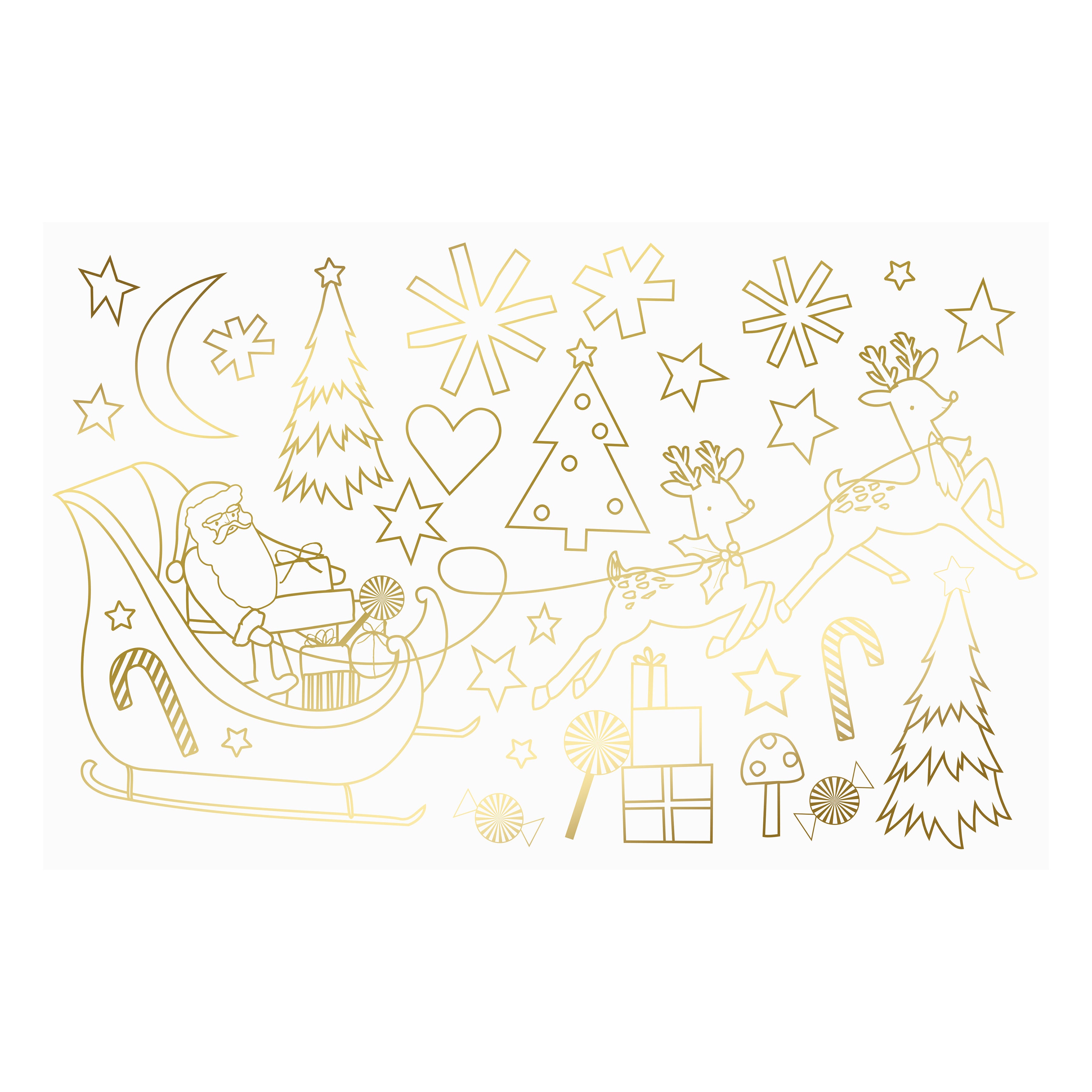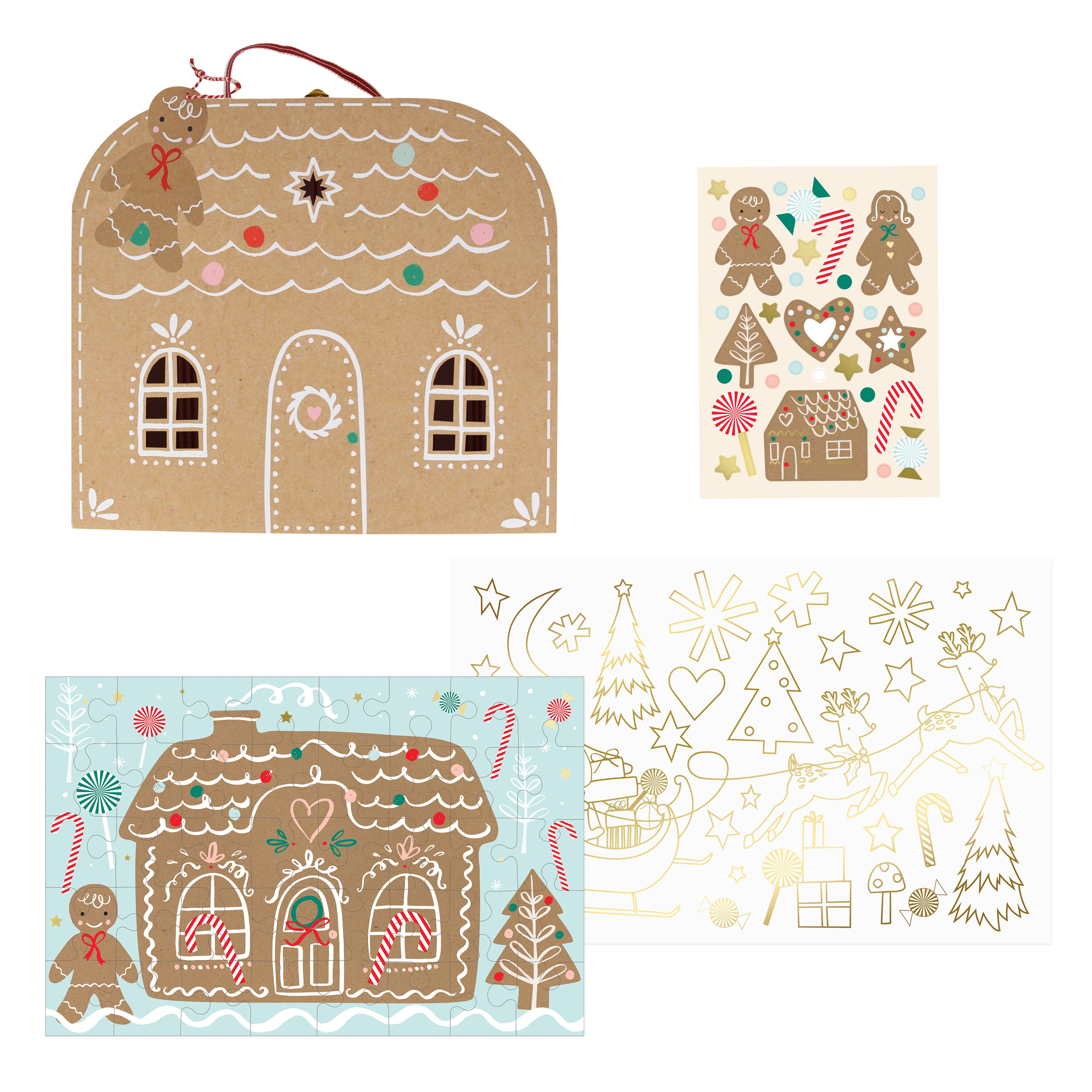 • The gifts include a cardboard puzzle, a coloring poster, and 2 sheets of stickers, all presented in a bag which comes with a shiny gold foil star sticker to seal it