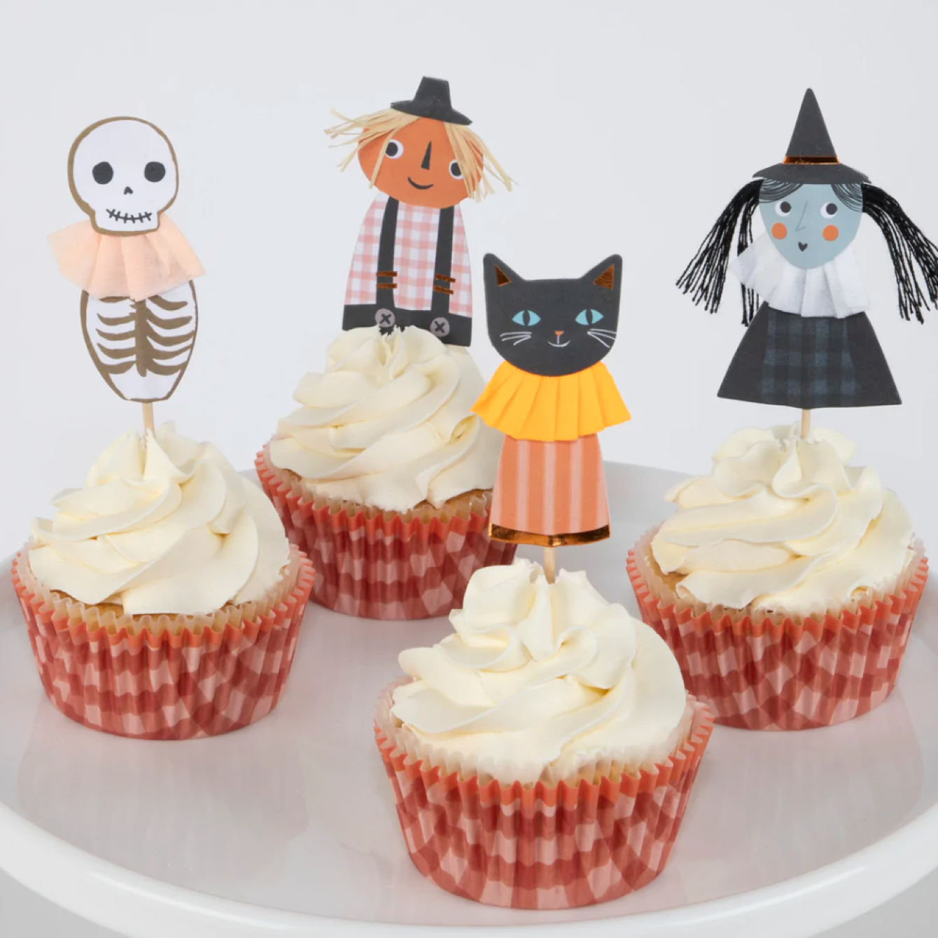 - The cat, witch and skeleton toppers have crepe paper ruffles