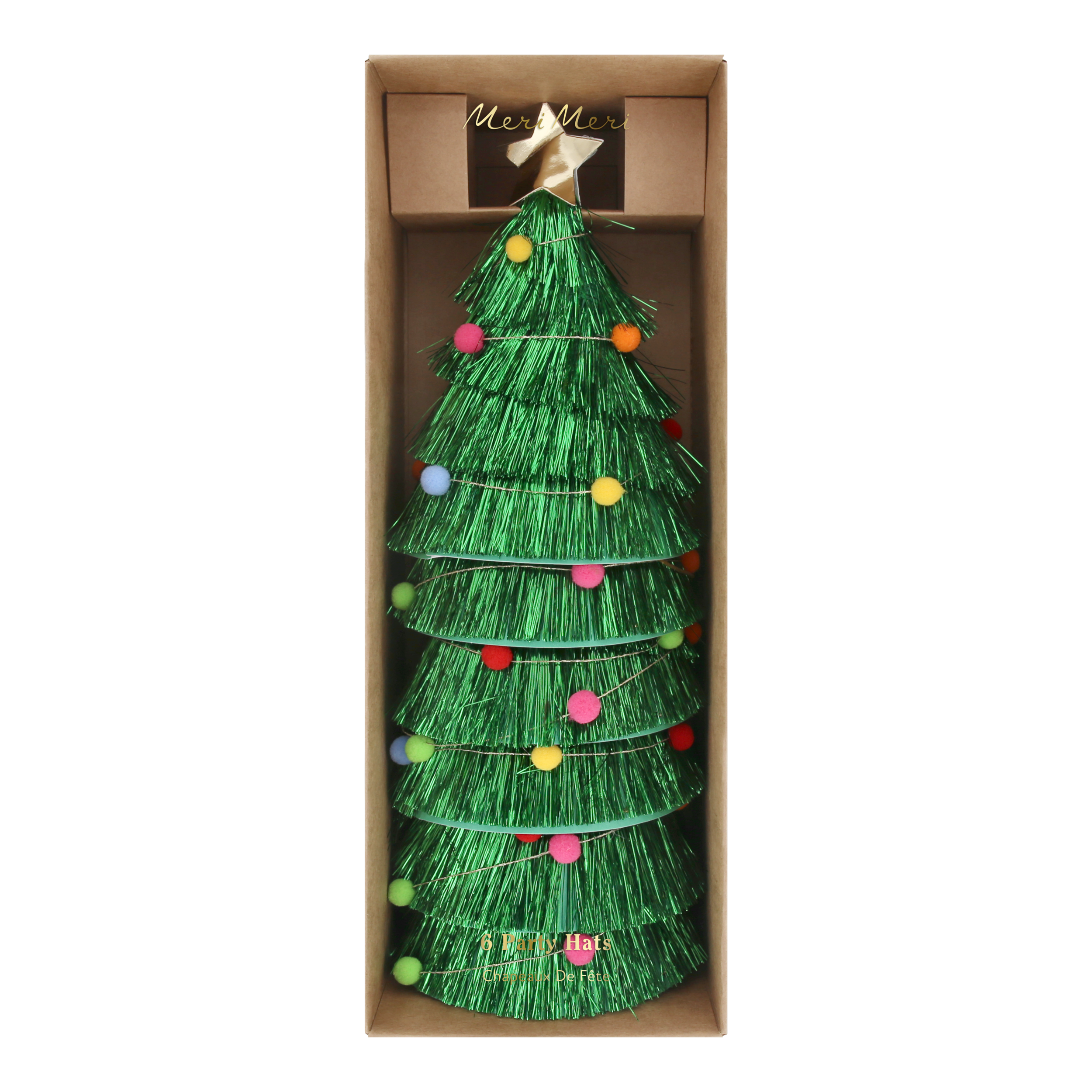 - 6 Paper party hats wrapped in a green tinsel fringe
