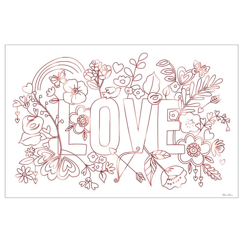 - One poster features pink foil illustrations of the word “Love” with flowers and cupid's arrow