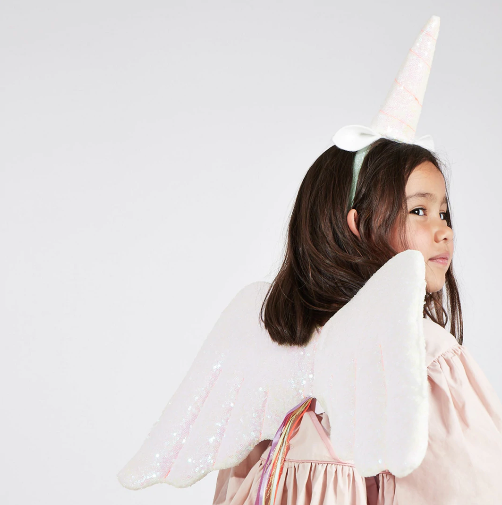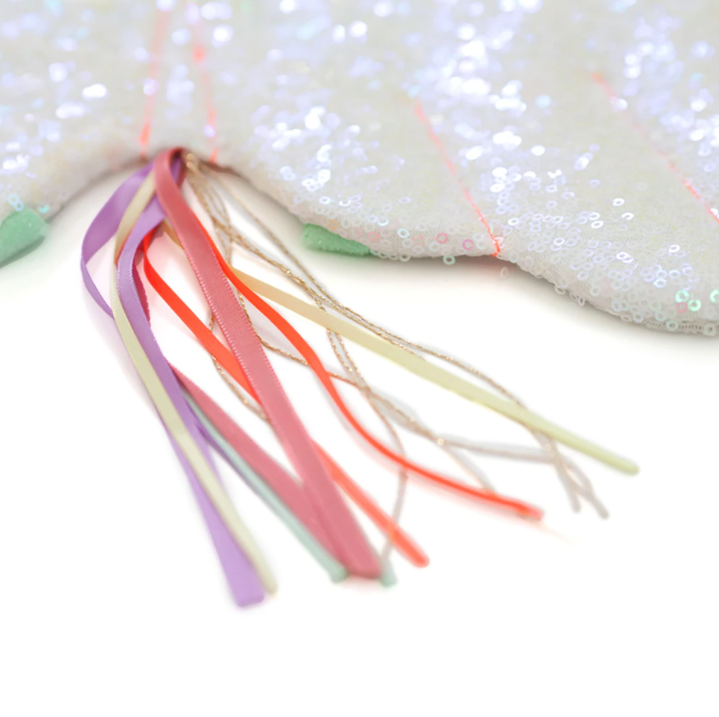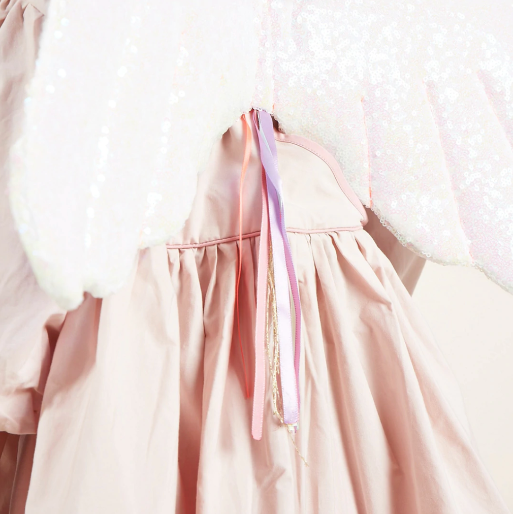 - Pink iridescent glitter sequin fabric wings with mint elastic arm straps
