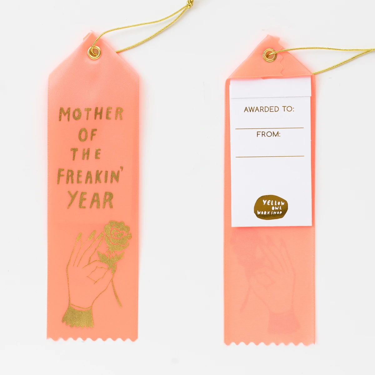 Our take on the classic award ribbon features luxe satin ribbon with a metallic cord, gold foil designs and a fold down note for your honorable mentions.