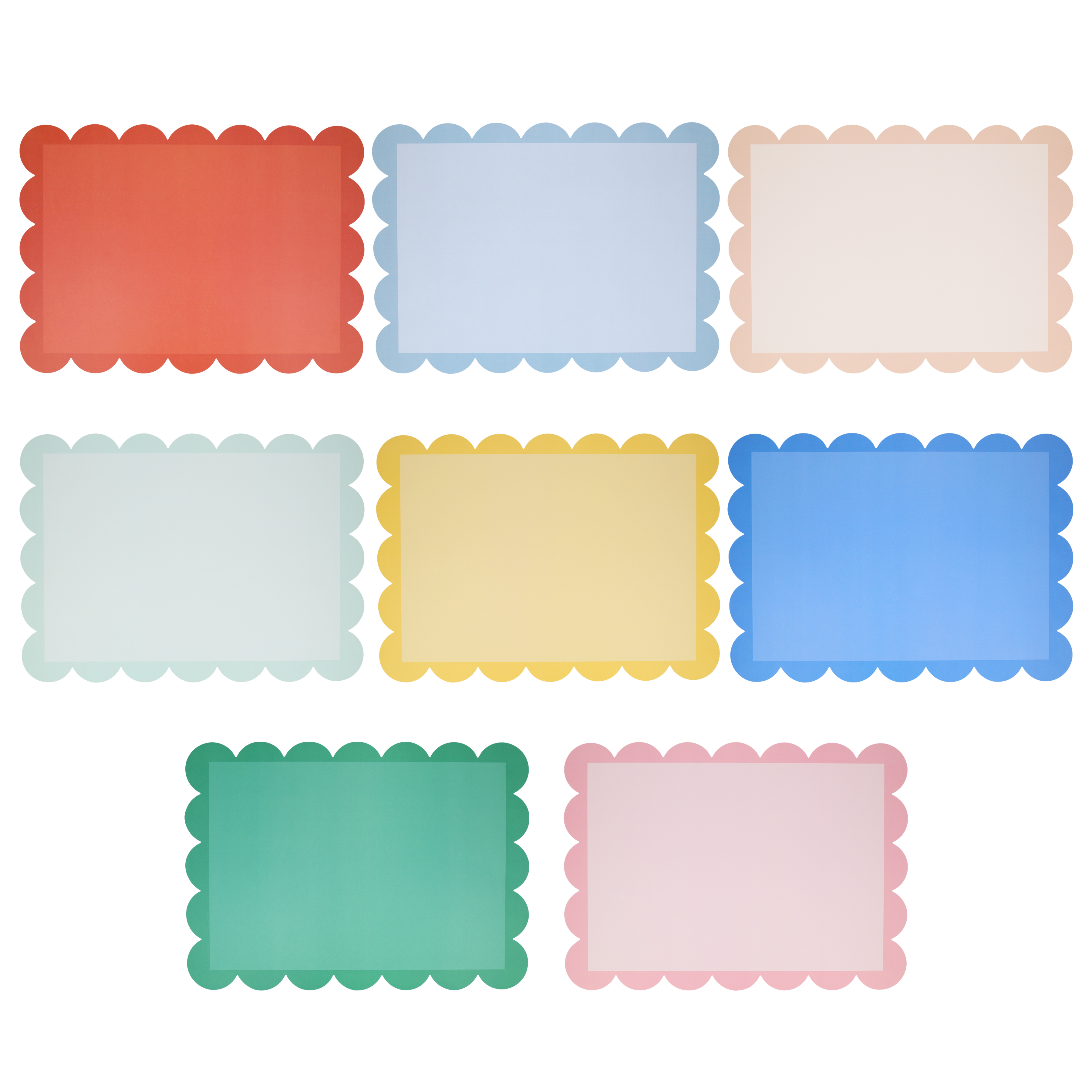 - 12 Placemats in 8 different color ways of red, dark blue, yellow, green, pink, peach, light blue and mint
