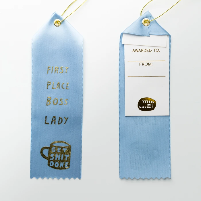 Our take on the classic award ribbon features luxe satin ribbon with a metallic cord, gold foil designs and a fold down note for your honorable mentions.