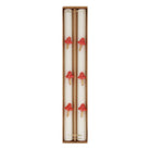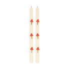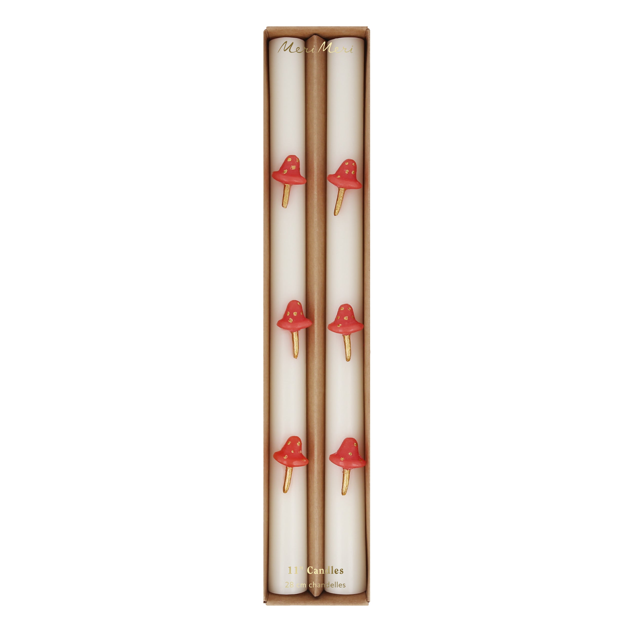 - Red wax mushrooms, with hand painted gold ink spots and stems, are attached to the candles
