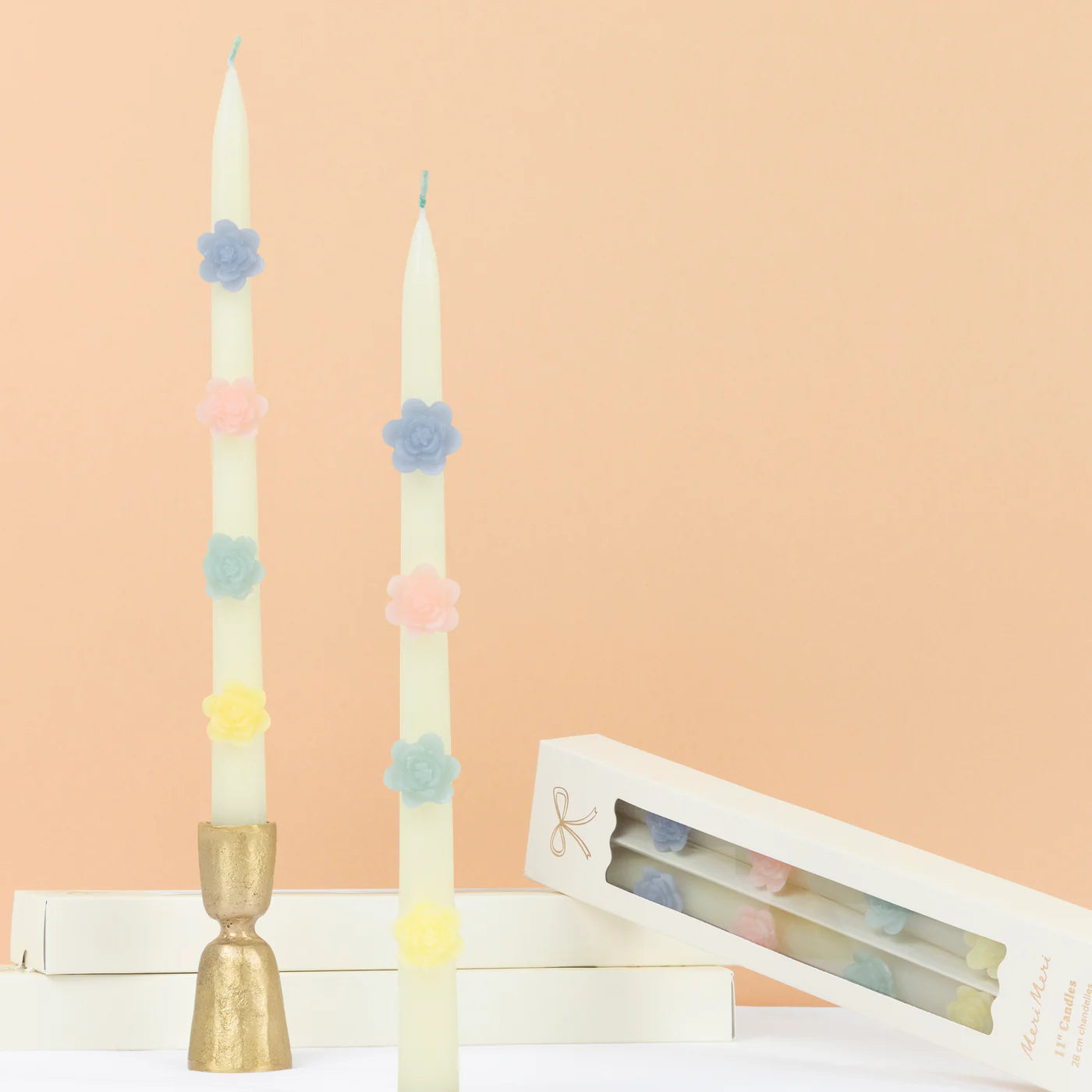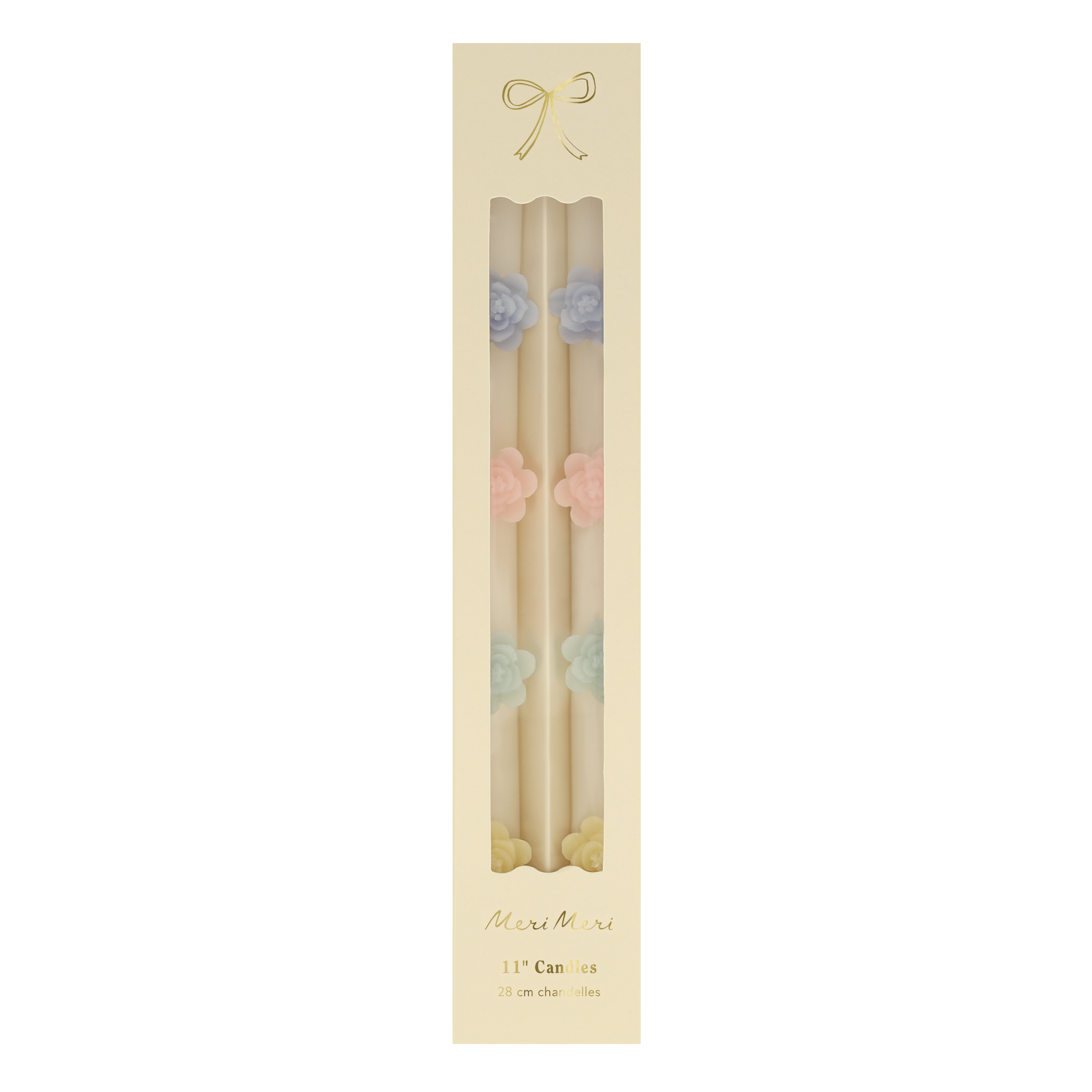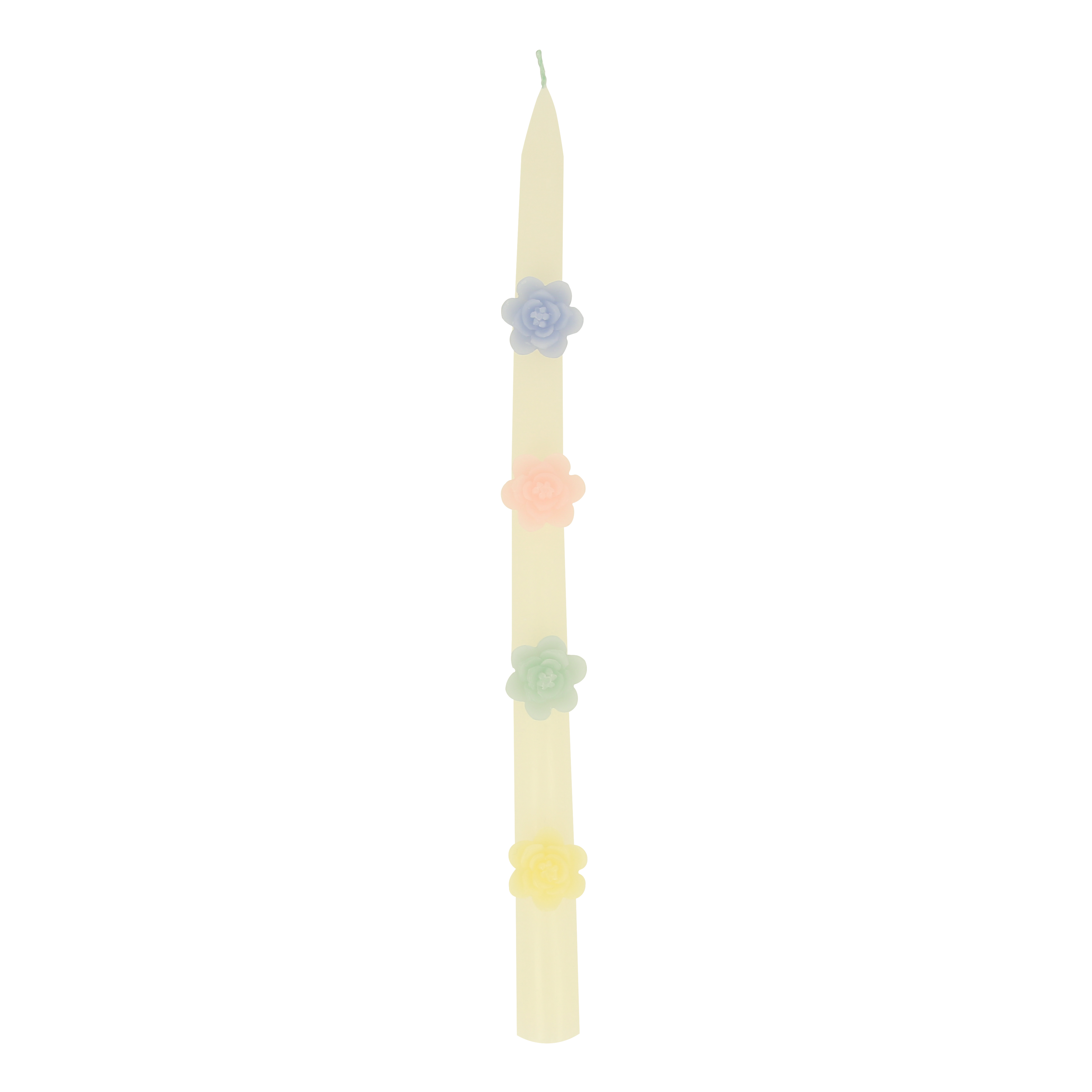 - Colored wax flowers in pastel blue, pink, mint and yellow