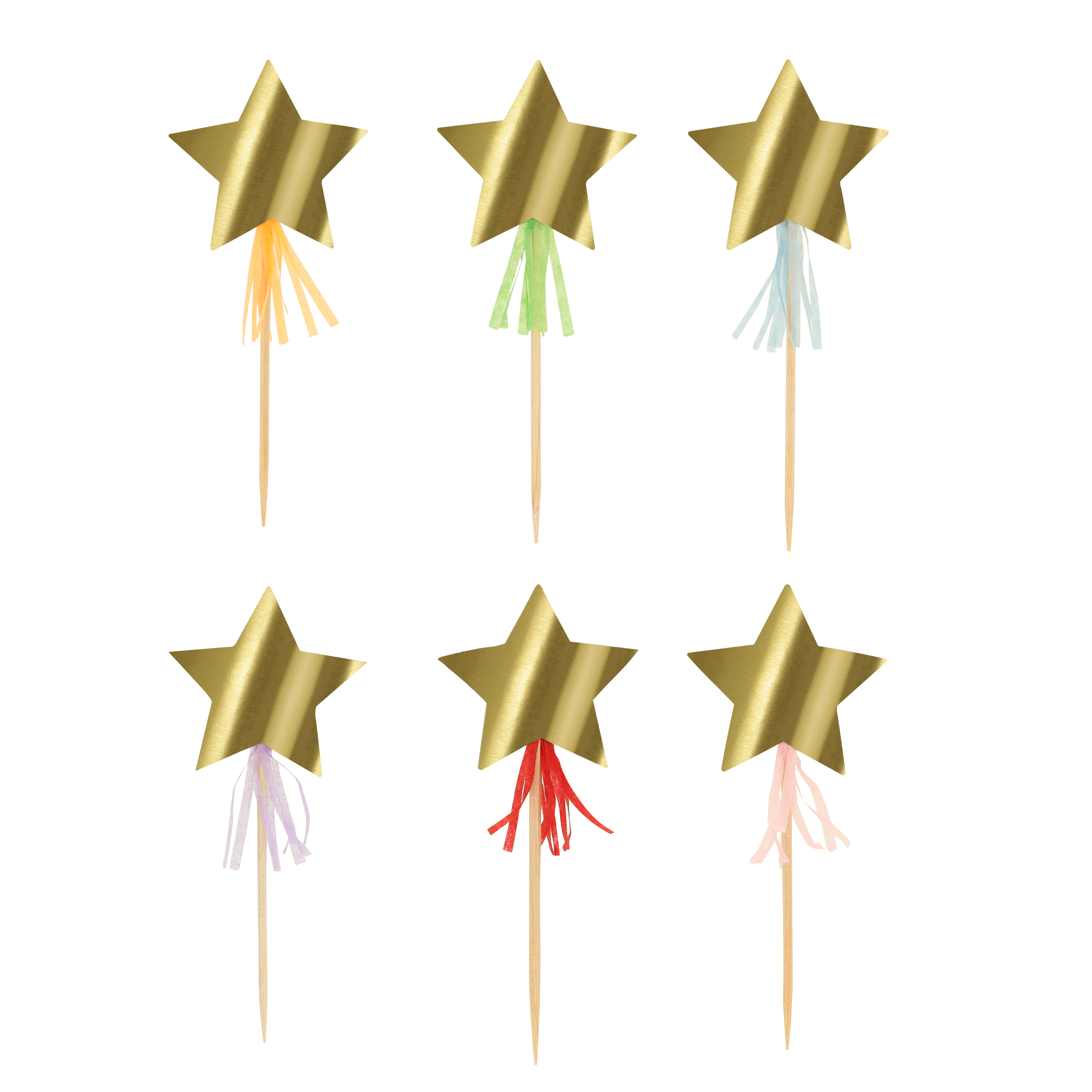 • 24 Cupcake toppers including shiny gold stars with tassels, honeycomb balls with tassels, honeycomb fans and Happy Birthday flags