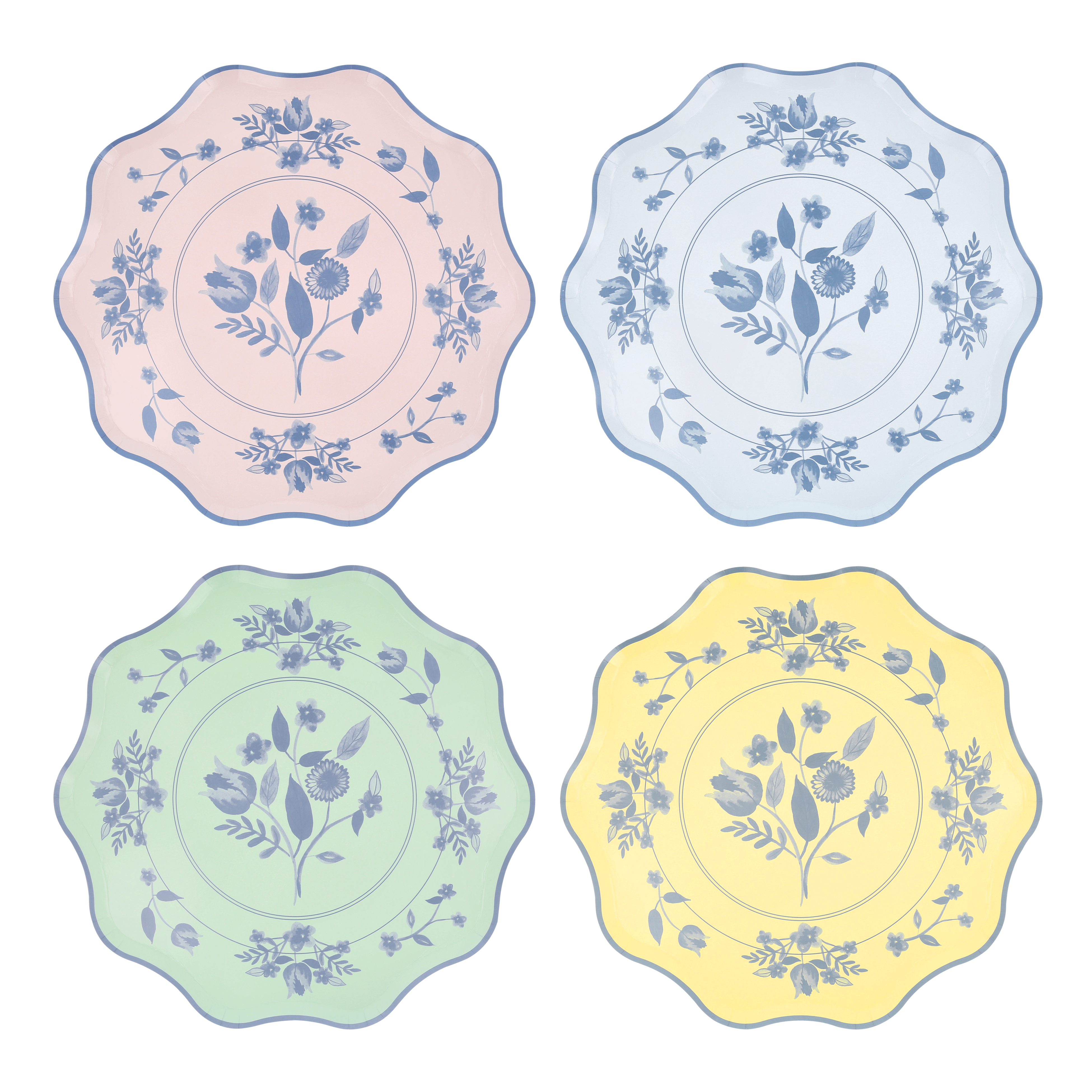 - Each set contains 2 x pink, blue, green and yellow plates